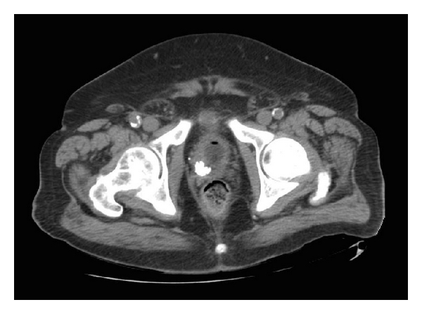 Dystrophic calcification occurs as a result of chronic inflammation or tissue necrosis. It is associated with several medical conditions such as collagen vascular disease, scleroderma, and systemic lupus erythematosis as well as with soft tissue injuries from trauma [1, 2]. In the genitourinary tract, dystrophic calcification has been reported in upper tract tumors, renal parenchymal disease, and squamous cell carcinoma of the bladder from schistosomiasis [3–5]. Cryotherapy of the prostate is a minimally invasive technique to treat localized prostate cancer. Under transrectal ultrasound (TRUS) guidance, transperineal probes are inserted into the prostate and cooled to −40°C resulting in tissue injury and coagulative necrosis. The most common side effects of cryotherapy are transient urinary retention from swelling, erectile dysfunction, and urethral sloughing [6]. However, there have been no reported cases of dystrophic calcification of the prostate in relation to cryotherapy.