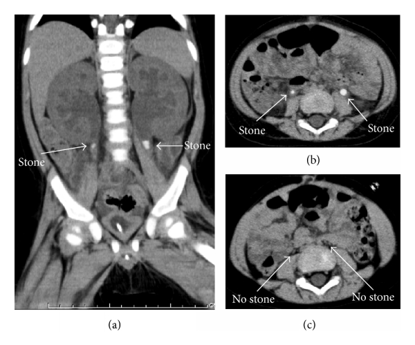 Case 3. A 15-month-old boy with a 5-day history of severe diarrhea and vomiting was referred to our hospital due to anuria and acute renal failure. USG and CT showed bilateral mild hydronephrosis and ureteral stones (Figures 1(a) and 1(b)), indicating postrenal failure caused by the obstruction of bilateral ureters with urinary stones. As in the other two cases, a percutaneous right nephrostomy tube was inserted under general anesthesia. Following treatment with hydration and urinary alkalization, sandy stones were drained out through nephrostomy tube on the 1st day. At 10 days after nephrostomy tube insertion, a right percutaneous antegrade pyelography showed that the obstruction due to ureteral stones was vanishing and the nephrostomy tube was extracted. At 3 months, a CT scan showed no evidence of stones (Figure 1(c)).