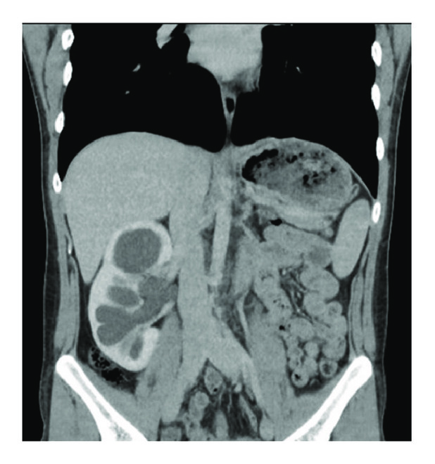 A twenty-three-year-old man was admitted to our outpatient clinic with right flank pain. Right costovertebral angle tenderness was positive on physical examination. Laboratory tests revealed an increased creatinin level at 1.2 mg/dL. Urinary tract imaging with ultrasonography showed grade 3 hydronephrosis in right solitary kidney. UPJO in solitary kidney with intrarenal pelvis was detected in urography images by CT scan (Figure 1). Diagnosis was confirmed by scintigraphic examination in which the urine was not able to pass through the ureter after diuretic injection. Informed consent was obtained for LP after providing information about the operation to the patient. The operation was performed transperitoneally using 4 trocars, one of which was 5 mm in diameter and the others were 10 mm in diameter. After lower pole mobilization, the ureter was dissected through the renal pelvis. When the kidney was lifted up, the intrarenal pelvis was exposed, and a relatively high insertion of the ureter was observed (Figures 2(a) and 2(b)). The dismembered technique was performed for UPJ reconstruction, and a DJ catheter was inserted antegradely. The operation was completed without any complications. Insufflation time was 240 minutes. The patient was discharged on postoperative day 3 with a creatinin level of 0.8 mg/dL.