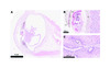 Ocular lesions included microphthalmia, multiple PPMs (iris-to-iris and iris-to-lens), microphakia with cataract formation, myovascularised membrane surrounding the cataractous lens and expanding into the vitreous towards the retina, retinal detachment, and retinal dysplasia (Figure 2). Moreover, Wallerian degeneration was identified in the optic nerve. In spite of the widespread ocular changes, the ciliary body was large and prominent. The detached retina contained only indistinctively/poorly developed different cellular layers; rosette formation was occasionally observed in the inner nuclear layer. These findings were classified as congenital microphthalmic syndrome. Since there was no histological evidence of inflammation in any of the examined ocular tissues, including the uveal tract and retina, the ocular changes were presumed to be of another cause than acute inflammatory disease.