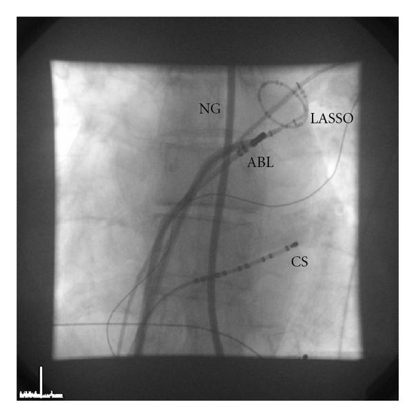 Immediately after having positioned both transseptal sheaths across the interatrial septum, therapeutic anticoagulation was initiated with a bolus of intravenous heparin (100 IU/kg). Activated clotting time (ACT) was monitored in 30-minute intervals followed by additional boluses of heparin to keep the ACT with a target of 300 seconds. During the transseptal catheterization, continuous monitoring of the electrocardiogram is performed to detect any coronary artery spasm provoked by the mechanical effects of the transseptal puncture on the interatrial vagal network or coronary artery embolism, and monitoring of the cardiac silhouette excursion on fluoroscopy and monitoring of the systemic blood pressure are performed to detect any impending pericardial tamponade. A circular mapping catheter and an ablation catheter were inserted through the transseptal sheaths for mapping and ablation at the pulmonary vein orifice (Figure 1).