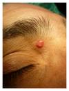 A 26-year-old white man presented in our department with a 2-year history of an asymptomatic enlarging lesion of the upper eyelid. No previous lesion, namely nevus sebaceous was documented. His personal and familiar medical history was unremarkable. On physical examination a well-circumscribe, firm, umbilicated, reddish, molluscum contagiosum-like nodule approximately 1 cm in diameter localized to the upper right eyelid was observed (Figure 1). Dermoscopy showed several telangiectasias in the surface of the nodule and a central umbilication (Figure 2). A basal cell carcinoma or an adnexal skin tumor was suspected. Surgical excision of the lesion was performed and the specimen was sent for microscopic examination.
