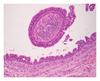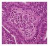 Microscopic examination showed a well-circumscribed dermal nodule characterized by a large cystic space containing eosinophilic debris and papillary folds. The lesion seemed to be connected with the epidermis and a central ulceration was observed. Papillae and micropapillae projected from the cyst wall into its cavity (Figure 3). The papillae had a broad fibrous core with aggregates of lymphocytes and few plasma cells (Figure 4). A basal layer composed by small cuboidal cells and a luminal layer composed by larger columnar cells was observed (Figure 5). These microscopic features were consistent with the diagnosis of hidradenoma papilliferum.