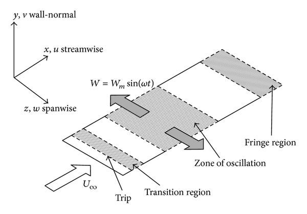 An illustration for the current problem setup is shown in Figure 2. After an initial trip of the flow, the flow undergoes transition to fully turbulent flow. The tripping has been described in detail in [29] and the quality of this methodology has been thoroughly investigated by Schlatter and Ćrlü [30]. A section of the resulting turbulent flow is then subjected to wall oscillations, as described below. At the end of the domain, there is a fringe region to satisfy periodic boundary condition as discussed in the previous section. Minimal upstream influence is ensured by the design of the fringe function [31].