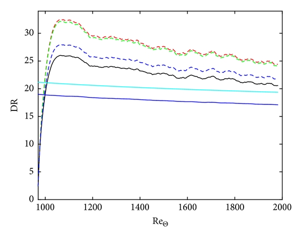 The influence of Reynolds number on DR is an important question for practical implementation aspects. This is still an open question and a clear understanding of the Reynolds number dependence of DR is presently lacking. Results from previous channel flow investigations with near-optimal oscillation parameters suggest a relation of the formwhere is the Reynolds number based on channel half width (), friction velocity (), and kinematic viscosity (). This relation was first suggested by Choi et al. [12]. Channel flow simulations with optimal oscillation parameters have subsequently suggested that . However, as indicated by Gatti and Quadrio [13], the value of the exponent in relation (1) is most probably dependent on the oscillation parameters; thus a universal relation will be unattainable. In addition, in the study of the Reynolds number averaged Navier-Stokes equations using a perturbation analysis by Belan and Quadrio [14], it is found that a relation of the typematches the data better. Hence, the DR approaches a constant value as .
