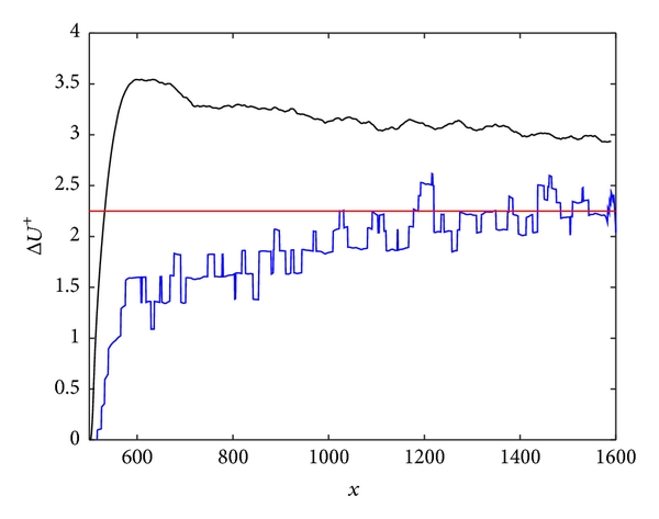 In the present case, where the DR is obtained by the oscillating wall technique, needs to be investigated. The downstream variation of the velocity shift according to (19) is shown in Figure 5 as the black curve, and is clearly not a constant. However, when calculating the change in the intercept of the logarithmic layer, the values seem to reach a constant value, as indicated by the blue curve. The intercept is here calculated by considering the indicator function,which for low Reynolds number flow never reaches a constant value, although a distinct local minimum is always found. By finding the local minimum and then at that position calculating the difference between the velocity from the reference and the drag reduced profiles, the shift of the logarithmic profile is derived. This shift is shown as the blue line in Figure 5 and is approaching a constant value. The red line in the figure is the constant value taken from the expression,derived from the relation in [11] where the constant was found to be . With the value of in the present case, expression (29) yields . from expression (19) is slowly approaching the value given by the velocity profiles, which indicates that the wake function is slowly reaching a new equilibrium. This scenario is consistent with the findings in [11].