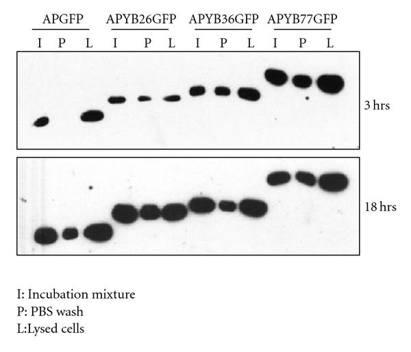 This was further confirmed by immunoblotting analysis. Nuclear and cytoplasmic extracts of rat hepatoma cells were analyzed by immunoblotting analysis using anti-GFP antibodies. These studies indicated that the APYBGFP fusion proteins were detected only in the cytoplasmic extracts of cells even after 18 hr, whereas the APGFP was detected both in nuclear and cytoplasmic extracts (Figure 3(b)). Less than 2 to 3% of the internalized APYBGFP proteins was found in the nuclei where as in the control APGFP as much as 30 to 40% was detected in the nuclei by 18 hours. We conclude that the presence of N-terminal amino acid sequence of YB-1 in the fusion protein is responsible for their restricted localization to the cytoplasm of cells.