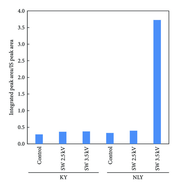The volatile content in treated and untreated yuzu fruits also differed, suggesting that, in addition to increasing the content of volatile compounds in the juice samples, the shockwave treatment also changed the scent intensity of the juice. The aroma characteristics of the citrus juice samples were analyzed by HS-GC/MS; this is close to sensory evaluation. Figure 1 illustrates the contents of volatile compounds calculated from the ratio of the integrated area of the aroma component relative to the area arising from the internal standard. The contents of volatile components of untreated KY and NLY fruits were determined as 0.287 and 0.329, respectively, indicating that NLY fruit juice exhibits stronger scent intensity than KY juice. The volatile content of KY juice increased with an increase in applied shockwave energy (~×1.3 at 3.5 kV). However, for NLY, a more marked increase (maximum concentration ratio = 3.72; ~×11.3 increase) was observed when SW 3.5 kV was applied.