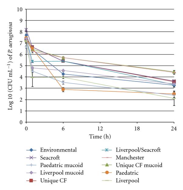 Within the first hour following inoculation of all the different strains of P. aeruginosa onto a dry glass surface, there was a rapid fall in viable counts of bacteria. All strains of P. aeruginosa were still able to be recovered at 24 hours but only at very low counts (Figure 1).