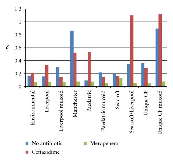 All nonepidemic strains had a significant reduction in following preincubation with meropenem (Environmental ; Unique CF ; Unique CF Mucoid ). All epidemic strains of P. aeruginosa also had a significant reduction in following preincubation with meropenem, apart from the Paediatric, Seacroft, and Liverpool strains where the reduction in was not statistically significant (Liverpool mucoid ; Manchester ; Paediatric mucoid ; Seacroft/Liverpool ).
