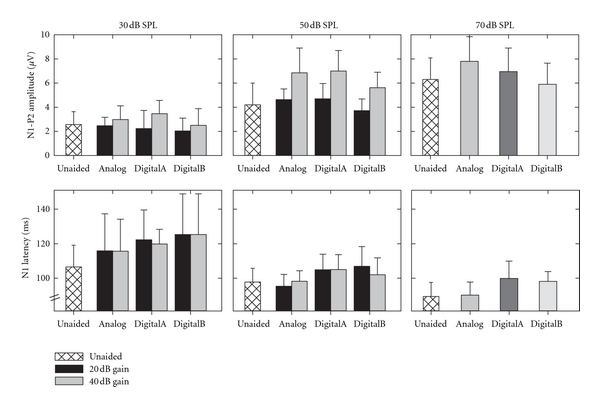 In order to determine whether hearing aid gain had an effect on response amplitudes and/or latencies, results for the two gain settings (20 and 40 dB) were compared across input level (30 and 50 dB SPL for amplitude and 50 dB SPL for latency). It is evident in Figure 2 that N1-P2 amplitudes are larger in the 40 dB compared with the 20 dB gain setting for all hearing aid types. Results from the ANOVA revealed a significant main effect for gain and for input level , as well as a significant interaction between gain setting and input level . Post hoc analysis showed significantly larger N1-P2 amplitudes for the 40 dB gain setting compared with the 20 dB gain setting at 50 dB SPL; however, no significant difference existed between N1-P2 amplitudes for the two gain settings at the 30 dB SPL input level. The main effect for hearing aid type was also significant , such that N1-P2 amplitudes were significantly smaller for DigitalB hearing aid condition compared with Analog and DigitalA hearing aid conditions. There was no significant interaction between hearing aid type and gain setting , hearing aid type and input level , or hearing aid type by gain setting by input level . These results are consistent with findings reported previously that there is little to no effect of gain for the 30 dB SPL input level, but a significant effect of gain for the 50 dB SPL input level.