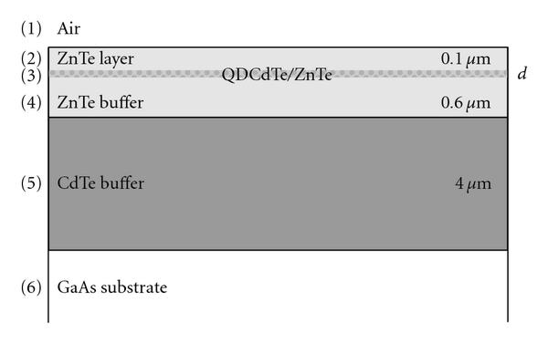 Investigated samples were grown by molecular beam epitaxy on GaAs substrate. CdTe buffer layer, 4 thick, was deposited on the substrate. After a 0.6 thick ZnTe layer, 3 or 12 monolayers (ml) of CdTe were deposited to form a random distribution of quantum dots. The dot layer was covered by 0.1 ZnTe capping layer, which is schematic presented in Figure 1. High mismatch of lattice parameters of CdTe (6.482) and ZnTe (6.104 ) provokes gathering of CdTe molecules and forming of quantum dots. Further details of the samples growth can be found in [1]. It is important to note that the chosen sample set enables us to study quantum dots (QD) with different lateral sizes. Namely, CdTe QDs are very small, and, as estimated by transmission electron microscopy and magneto-photoluminescence measurements, their lateral size is of the order of 2–4 nm in diameter in sample with 3 ml. In second sample (12 ml) there are no CdTe islands; that is, there is a layer with CdTe regions surrounded by alloyed material. This work is focussed to emphasize different properties of these two cases.