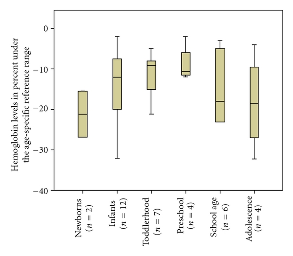 Statistical analysis: the data were processed using a standard statistical package (SPSS 15.0, SPSS Inc., Chicago, IL, USA) for Windows software. All data are reported as mean ± standard deviation. P values less than 0.05 were considered statistically significant. Continuous variables were compared with a Mann-Whitney-U-test. For the correlation of age and severity of anemia, Pearson's correlation coefficients were calculated.