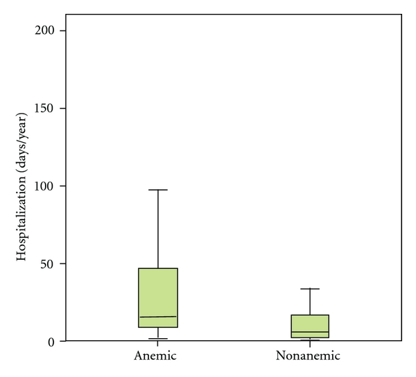 Anemic patients had significantly higher hospitalization rate from decompensated CHF than those without anemia (mean days per year versus , ) (Figure 2). Concerning the mortality rate of pediatric heart failure patients, there was no significant difference between anemic and nonanemic patients in this study population (23% versus 15%).