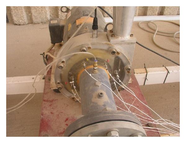 The model pump speed is 3540 rpm at 60 Hz. The flow rate is measured by an orifice meter with a discharge coefficient of 0.618. Orifice pressure taps are connected to a PDCR 4170, 700 mbar differential pressure transducer, which has 0.08% FS accuracy. The flow rate is controlled by a gate valve in the discharge pipe. The investigation of the flow induced vibration behavior under variable flow rate and different impeller-gap combinations is done by measuring the pressure fluctuations inside pump volute, the pump vibration, and pump performance. Measurements of pressure fluctuations are carried out using OMEGA’s DPX101-250 high-responses dynamic pressure transducers. Pressure transducers were arranged in geometrical symmetry positions around the impeller and at expected critical locations inside the pump as shown in Figure 3. The coordinates of these locations relative to the volute horizontal centerline (Ref.) are given in Table 1. Nine pressure transducers were placed flush within the volute Plexiglas cover plate at the impeller discharge. One pressure transducer was placed at the discharge pipe and another at suction pipe. A photograph of the model pump testing is shown in Figure 4. In this setup, the same Plexiglas cover plate can be used for dynamic and static pressure measurements inside the pump at the same locations described in Table 1. Vibration of pump casing was measured using a B&K 4507 Delta Tron accelerometers.