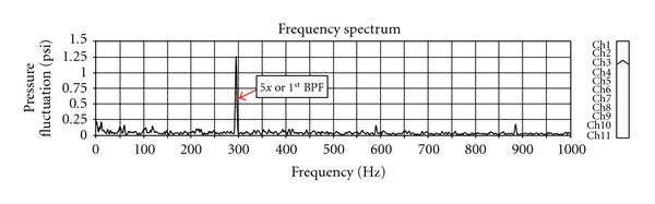 A typical vibration signal (vertical direction) of the pump casing is shown in Figure 10 at flow ratio . The 1st BPF is clearly dominating the frequency spectrum. The same behavior was recorded earlier in Figure 6 for the pressure fluctuations inside the pump. The frequencies at which pressure fluctuations attained maximum peaks are the same at which the high-level vibrations were recorded on the pump casing. In either case, the maximum peak coincided with the first BPF. Such a finding has revealed more insight into this problem and consolidated the confidence that vibrations at the original BPF are primarily flow induced, as they are attuned with signal of the internal pressure pulsation.