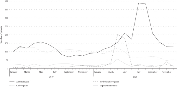 This study has other limitations secondary to its observational design. Some variables of interest were not available, such as the age of the treated patients, comorbidities, and the detailed classification of each care service and their respective number of beds. In addition, the comedications received by patients that were not directly related to prolongation of the QT interval and that could affect the risk of complications were not verified. Additionally, diagnoses were not reviewed (for example, to verify the total cases of COVID-19 cases attended in the study institutions or the specific use of drugs intended for COVID-19 management) nor were reports of adverse reactions. Baseline characteristics were only available as aggregates, and it was not possible to analyze 2019 data in detail. Lastly, electrocardiogram reports were also not available. Further studies describing the use of these particular therapies are needed.