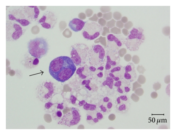 BAL cytocentrifugates analyses are summarized in Table 2. Large, atypical cells with plasmocytoid appearance were observed in all three specimens with similar percentages (8, 9, and 6%, resp.). At LM, they appeared as large, plasmoblastic/plasmocytoid-like cells with eccentric nuclei and paranuclear vacuoles, high ratio nucleus/cytoplasm, and intensely basophilic cytoplasm. No clear viral cytopathic effect was observed (Figure 1). Immunocytochemical analysis on cytocentrifugate showed that these cells were negative for CD20 (B lymphocyte marker) and CD138 (plasma cell marker).
