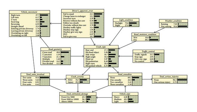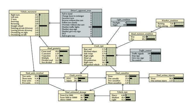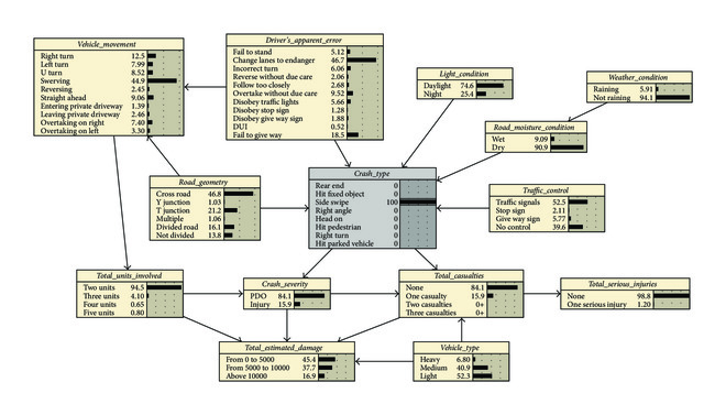 Bayesian network is one of the effective methods in the field of artificial intelligence to express uncertainty analysis and probability reasoning of a system. It can exploit the dependence relationships based on local conditions in a model to conduct bidirectional uncertainty investigation for prediction, classification, and diagnostic analyses. At present, there are some software platforms available for the construction of a Bayesian network, such as Bayes Net Toolbox (BNT), BayesBuilder, and JavaBayes, of which the MATLAB-based BNT developed by Murphy [13] is extensively used. This toolbox provides a lot of underlying basic function libraries for Bayesian network learning, but it does not integrate the basic functions for Bayesian network learning into a system. Moreover, BNT does not have Graphical User Interface (GUI), which is not user-friendly, nor can it be well generalized. Netica is a Bayesian network learning software developed by Norsys Software Corporation in Canada, which has been extensively applied in uncertainty management such as business, engineering, medicine, and ecology [14–16] due to its powerful functions, friendly GUI, reliable computation, and good performance. In this paper, a model is formulated using Bayesian network for road accident studies, and then a Bayesian network learning process, posterior probability reasoning, most probable explanation, and inferential analysis are conducted by using Netica.