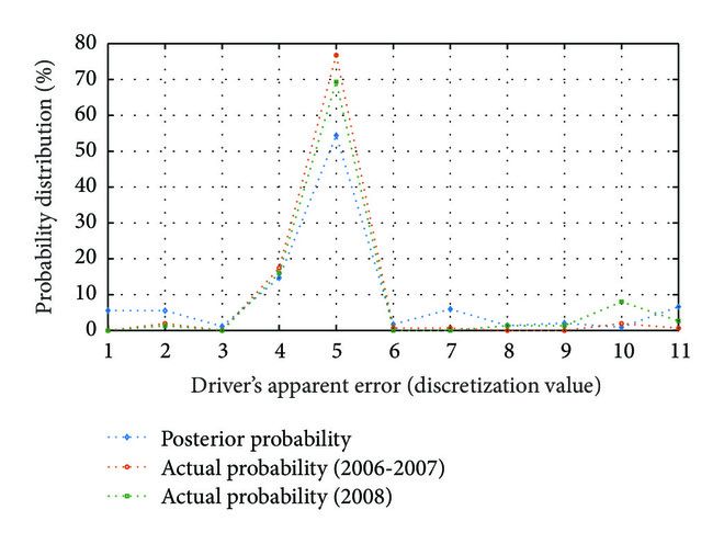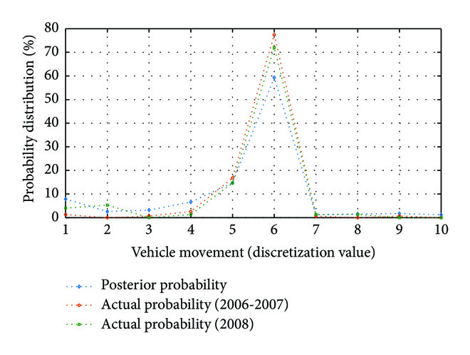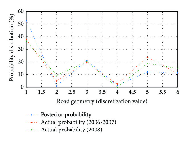 Figures 5, 6, and 7 show the posterior and actual probability distributions of “driver’s apparent error,” “vehicle movement,” and “road geometry,” respectively, when the evidence variable is “rear end.” Compared with the actual computational results from 2006 to 2007, the maximum mean absolute error (MAE) of Bayesian network model is 5.58%. Similarly, compared with the actual computational results of 2008, the maximum MAE is 6.14%, which suggests that the Bayesian network model has both high fitting accuracy and high prediction accuracy. Therefore, it is feasible to use the Bayesian network model to conduct result prediction and inferential analysis of each variable of road accidents accordingly.