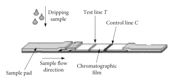 Immunochromatography is also called immunoaffinity chromatography. The specific antigen-antibody binding reaction has high affinity and specificity. Antigen or antibody can be coupled to column packing by using immunochromatography to prepare an affinity chromatography column. The specific immune components that are simple with antigens or antibodies can be quickly and efficiently isolated and purified from complex mixed samples by the chromatography column. It is the most selective and effective method for isolation and purification of specific antibodies [6, 7]. The immunochromatographic reaction was carried out on the nitrocellulose membrane of the reagent strip. The main immunochromatographic strip has the characteristics of strong maneuverability, high accuracy, and no pollution, which is mainly composed of sample pad, binding pad, nitrocellulose membrane, and water absorption filter paper [8]. Immunochromatographic reaction is on the cellulose membrane and the control zone. The realization of chromatography requires a mobile phase and a stationary phase [9, 10]. The mobile phase is a substance that flows transversely in the reagent strip, and the stationary phase is a nitrocellulose membrane on the reagent strip, which mainly exists in the test zone and the control zone. When the mixture flows through the stationary phase with the mobile phase, its different substances are separated by affinity chromatography [11]. T-line (test line) has specific immune response, and C-line (control line) has specific immune response, as can be seen in Figure 1.