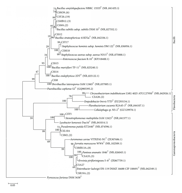 Fifty-six bacterial strains were successfully isolated (Table 3) from this sample using 7 different culture media. The phylogenetic analysis, based on 16S rRNA gene sequences, classified the isolated strains within 17 different OTUs (Figure 3). They were distributed into 3 classes: Bacilli (36 strains), Flavobacteria (2 strains), and Gammaproteobacteria (18 strains). According to their 16S rRNA gene sequences, these strains are similar to bacterial strains associated with human disease, like Bacillus, Serratia, Enterobacter, and Pantoea species, or associated with biocontrol agents such as Brevibacillus laterosporus, Chryseobacterium indoltheticum, and Pantoea ananatis. However, more studies are necessary to verify the real source of these microorganisms. In addition, populations similar to Bacillus amyloliquefaciens and Pseudomonas putida were also found. Such species are reported as natural antifungal agents, which also can metabolize nitrogen and enhance the fertility.