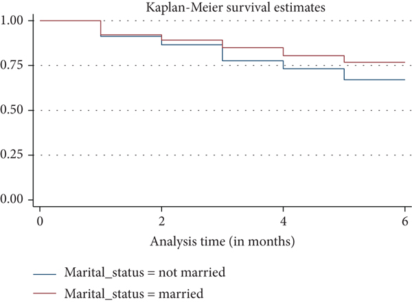 The Kaplan-Meier curve indicated that as time goes on, babies are less likely to be exclusively breastfed, more so after the second and third months. Thus, the chances for a baby to remain exclusively breastfed after five months is less than 75% for unmarried mothers as indicated in Figure 1.