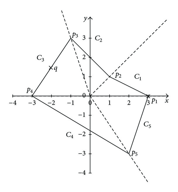Example A.1. Let be a pentagon given by the vertices , , , , and and a convex polyhedral fan for , where , , and ; see Figure 12. Applying Lemma 2 (b1), where , , , , and the Minkowski functional of can be represented as Let and .