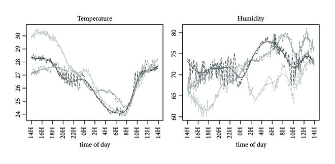 In this analysis we center the attention on the effect of the ambient temperature and humidity on the 1st quartile of the proxy stress measures and gain more understanding of the food consumption of sows that are most susceptible to heat stress. While the association between the feed intake of lactating sows and the ambient conditions of the farrowing room has been an active research area for some time, accounting for the temperature daily profile has not been considered yet hitherto. Figure 1 displays the temperature and humidity daily profiles recorded at a frequency of 5-minute window intervals for three different days. Preliminary investigation reveals that temperature is negatively correlated with humidity at each time; this phenomenon is caused because the farm uses cool cell panels and fans to control the ambient temperature. Furthermore, it appears that there is a strong pointwise correlation between temperature and humidity. In view of these observations, in our analysis we consider the daily average of humidity. Exploratory analysis of the feed intake behavior of the sows suggests similarities for the sows with parity greater than older sows (ones who are at their third pregnancy or higher); thus we use a parity indicator instead of the actual parity of the sow. The parity indicator is defined as one, if the th sow has parity one and zero otherwise.