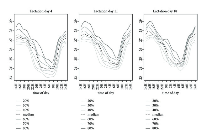 Interpretation of the other results is similar. While the effects of covariates on feed intake are less apparent toward the end of lactation period, we still observe similar pattern across all three lactation days. For the 11th day (), the 25th quantile of the feed intake is predicted to decrease when the temperature stays below the th percentile, regardless of humidity level and sows age. However, it starts increasing with low humidity while it continues decreasing with high humidity when the temperature rises above the th percentile. Similarly, for the 18th day () when the temperature rises above the th percentile, the predicted first quartile increases with low humidity while it decreases with high humidity. The effect of temperature on feed intake seems less obvious for lactation days 11 and 18 than for day 4; while the effect may be due to lactation day, it may also be a result of other factors, such as more fluctuation and variability in temperature curves on day 4 than on other two days (see Figure 2). Overall we conclude that high humidity and temperature affect the sows feed intake behavior negatively and young sows (parity one) are more sensitive to heat stress than older sows (higher parity), especially at the beginning of lactation period.