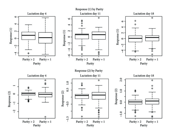 Let be the th measurement of the feed intake observed for the th sow and denote by the lactation day when is measured; here . Most sows are observed every day within the first 21 lactation days and thus have . First define the absolute change in the feed intake between two consecutive days as for that satisfies . For instance, means there was no change in feed intake of sow between the current day and the previous day, while means that the feed intake consumed by the th sow in the current day is smaller than the feed intake consumed in the previous day. However, the same amount of change in the feed intake may reflect some stress level for a sow who typically eats a lot and a more serious stress level for a sow that usually has a lower appetite. For this, we define the relative change in the feed intake by , where is the trimmed average of feed intake of th sow calculated as the average feed intake after removing the lowest and highest of the feed intake measurements taken for the corresponding sow. Here is surrogate for the usual amount of feed intake of the th sow. Trimmed average is used instead of the common average, to remove outliers of very low feed intakes in first few lactating days. For example, consider the situation of two sows: sow that typically consumes 10lb food per day and sow that consumes 5lb food per day. A reduction of 5lb in the feed intake over two consecutive days corresponds to for the th sow and for the th sow. Clearly both sows are stressed (negative value) but the second sow is stressed more, as its absolute relative change is larger; in view of this we refer to the second response as the stress index. Due to the construction of the two types of responses, the data size varies for lactation days 4 (), 11 (), and 18 (); for the first response, , we have sample sizes of 233, 350, and 278, whereas for the sample sizes are 362, 373, and 336 for the respective lactation days.