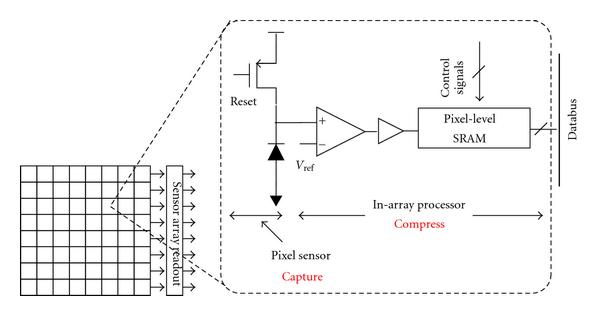 A typical smart image-sensor system implements the image-capturing device and the image processor into separate functional units: an array of pixel sensors and an off-array processing unit as illustrated in Figure 1. Active Pixel Sensor (APS) array is widely used to convert light intensity into analog signals. A standard APS architecture includes a photodiode, a transfer gate, a reset gate, a selection gate, and a source follower readout transistor. The reset gate resets the photodiode at the beginning of each capture phase. The source follower isolates the photodiode from the data bus. The analog signals from the sensor array take raw pixel values for further image processing. Different designs have been reported in the literature implementing different compression algorithms in the off-array processor.