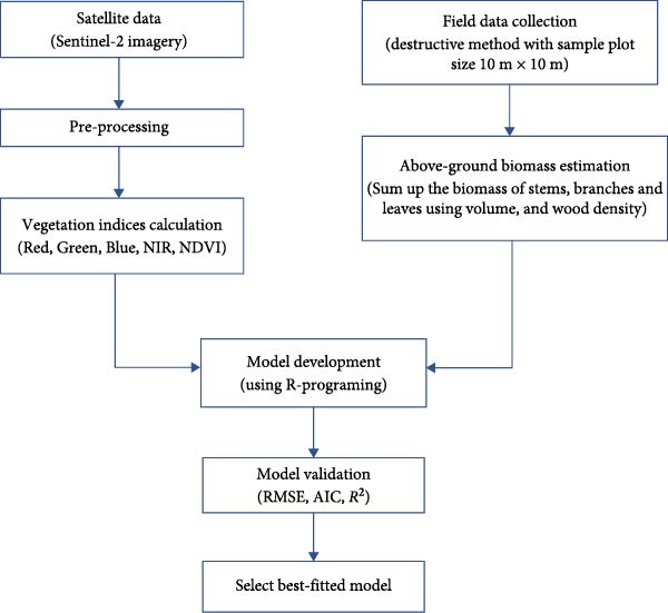 ArcGIS software (Version 10.8) was utilized for creating a study area map and calculating vegetation indices using the Sentinel-2 imagery data. MS Excel was employed for recording field data and performing calculations for tree volume and biomass. The R-Programme and SPSS (version 23) were employed for generating various models.