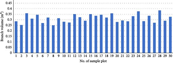The results revealed that the mean stem volume per plot was 0.855 m3, ranging from a minimum of 0.726 m3 to a maximum of 1.148 m3 (Figure 3). The average oven-dry wood density of the stem was 696 kg m−3, with a minimum of 676 kg m−3 and a maximum of 714 kg m−3 (Figure 4). Analysis of Figure 5 indicated that the average branch volume per plot was 0.313 m3, with sample plot 8 having the lowest volume of 0.250 m3 and sample plot 28 having the highest volume of 0.385 m3. Sample plots 19 and 23 exhibited the lowest branch oven-dry wood density of 627 kg m−3, while sample plot 12 had the highest density of 660 kg m−3. The average oven-dry wood density for branches was 643 kg m−3 (Figure 6). Additionally, the mean weight of fresh leaves per plot was 45 kg, with a minimum of 35.4 kg observed in sample plot 21 and a maximum of 56.2 kg observed in sample plot 24 (Figure 7). Furthermore, Figure 7 illustrates that the average oven-dry weight of leaves per plot was 17.51 kg, ranging from a minimum of 13.81 kg to a maximum of 23.60 kg.