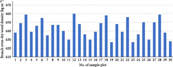 The weight of wood samples measuring 2 × 2 × 2 cm3 and the quantity of leaves collected from the sample plot were measured both before and after being dried in the laboratory. The leaves were dried at a temperature of 75°C until three consecutive measurements indicated a constant weight. Similarly, the wood samples from the stem and branches were dried at a temperature of 80°C until three consecutive measurements indicated a constant weight, as recommended by Chapagain et al. [27].