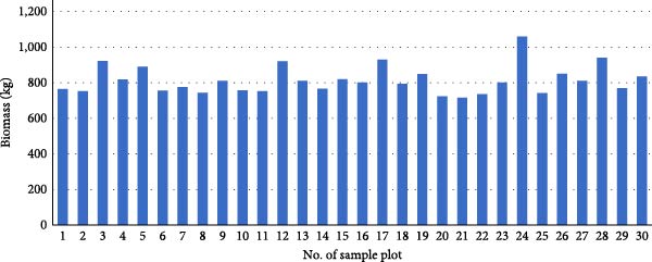 Among the 30 sample plots, the average biomass was 814 kg with a standard deviation of 14.33 kg, and the range of AGB values varied from the lowest value of 716 kg to the highest value of 1,060 kg (Table 1). The median AGB value was 801.7 kg per plot, and the most commonly observed AGB value was 810 kg per plot. The range of AGB values observed in the field was 344 kg per plot, with a standard deviation of 78.5 kg.