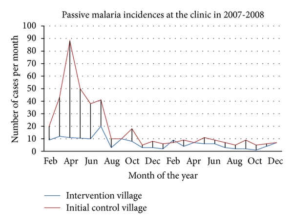 Malaria cases were detected passively at the village clinic established by the nearby Dominion farm. The two villages of our study were about 2 km away from the clinic. People seeking treatment were compared to the list of people participating in the study either in intervention group or control group but with status blind to the clinic personnel. No other records of malaria cases were used, and self-treatment in households was not followed. Malaria was identified using clinical manifestation, and we added rapid diagnostic testing after training the staff. Rapid diagnostic tests (RDT: Paracheck PF tests kits) were carried out according to the manufacturer’s instructions. Children under five years who were clinically identified as malaria positive were treated, irrespective of the results for Paracheck test in accordance with the national guidelines. Children older than five years and adults were first examined and scored clinically then tested with Paracheck but only treated according to MOH guidelines in 2007 amodiaquine (10 mg/day) for 3 days if a Paracheck result was positive for malaria [11]. These guidelines were changed in 2010, and the study is thus not concerned. Malaria incidence rate per month was determined.
