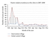 The study collected morbidity results on passive and clinic-based cases and showed a significant difference in malaria cases during the six months of trials between the original intervention area and the original control area. The incidences rate was higher in the control village (41.3%) compared to intervention area (16.3%). When bed nets were used in both areas, the incidences of malaria cases in the two areas were no longer different. In the second year, malaria incidence as measured here remained low in both areas (Figure 2). Of interest, the peaks of malaria incidence nearly disappear and what remains is year round “background” malaria not influenced by the bed nets.