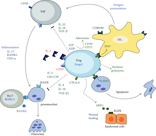 Another immuno-suppressive function of Tregs is the inhibition of osteoclast differentiation and their bone-resorptive activity [29]. In vitro studies, with human or murine Tregs, have shown that these cells can inhibit the differentiation of monocytes/macrophages to osteoclasts by the secretion of TGF-β, IL-4, and IL-10, and by the interaction of CTLA-4 with CD80/86 receptors present in osteoclasts and their precursors [30, 31]. In an in vivo study of osteoporosis, it was reported that the adoptive transfer of murine Tregs to Rag1−/− mice, deficient of T cells, increases the total bone mass associated with the decrease in the number of osteoclasts [32]. In addition, in patients with rheumatoid arthritis, nTregs secrete low levels of regulatory cytokines and have defects in the expression of CTLA-4, which is associated with increased bone destruction [29]. Therefore, Treg may present important suppressive functions during inflammation-mediated bone destruction, as well as in bone homeostasis.
