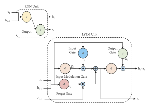Long short-term memory (LSTM) and gated recurrent unit (GRU) handle the problem of vanishing gradients using their gates. They have control over the information passing between the hidden states. These two networks are essentially the RNN variants with independent hidden and cell states. Figure 1 depicts the variances of the two networks, RNN and LSTM. The LSTM has three gates as shown in the diagram: forget, input, and output gates. The forget gate (equation (1)) is a single-layered architecture with sigmoid activation. This activation function in the forget gate assists in determining whether to preserve the information or discard it.