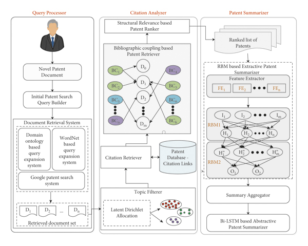 The main contributions of this paper are as follows:(1)Filtering the base query processor patent resultant set as it contains more irrelevant documents through Latent Dirichlet Allocation (LDA).(2)Enhancing the filtered patent set through bibliographic coupling.(3)Ranking the retrieved prior-art search patent set based on the structural similarity.(4)Generating extractive summaries with stacked RBM.(5)Employing the Seq2Seq model with pretrained embeddings and attention for generating abstractive summaries.