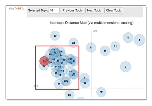 Figure 3 represents the intertopic distance using the LDAvis tool for the sample patent application titled “Bluetooth beacon attendance system based on smartphone and application method.” This figure focuses on the topic and its closeness with other related topics. As their closeness represents their similarity, closely linked topics are only taken into account for further processing. In this case, the documents which belong to the topics highlighted by a red box are only chosen as relevant document clusters.