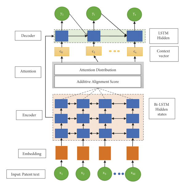 In a simple Seq2Seq model, the encoder usually returns a fixed length context vector that will not retain important information mainly if the input sequence is very long as in the case of the patent document. To deal with this, Bahdanau et al. [57] developed an alignment mechanism where at each time step, it focuses on the crucial parts of the text and generates a context vector . The context vector is achieved by computing attention distribution over the entire sequence of tokens given hidden encoder state and decoder state at time step . The alignment scores are computed using additive attention. Additive attention linearly combines encoder and decoder hidden states and is given bywhere both and are weight matrices.