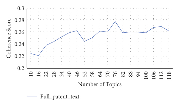 The number of topics for each retrieved patent set must be selected before generating the topic model to filter out irrelevant documents. The filterer computes the coherence score to determine the number of topics. It employs a trial-and-error approach to discover the best model by constructing multiple LDA models with topics ranging from 10 to 120. After comparing the coherence scores of multiple models, the model with the optimum coherence score is picked. The coherence scores of multiple LDA models for the sample prior-art search query after iterating 5 times and their mean scoring for different topics are shown in Figure 5. Here, the coherence score varies from 0.22 to 0.28, increasing as the number of topics increases. The optimal coherence score is chosen as the model has highest coherence score before a significant drop or flattening. The optimal coherence score is attained when . Based on the intertopic distance between the topics, the topics are chosen. The topic clusters and their documents that are close to the principal relevant topic are considered as relevant.
