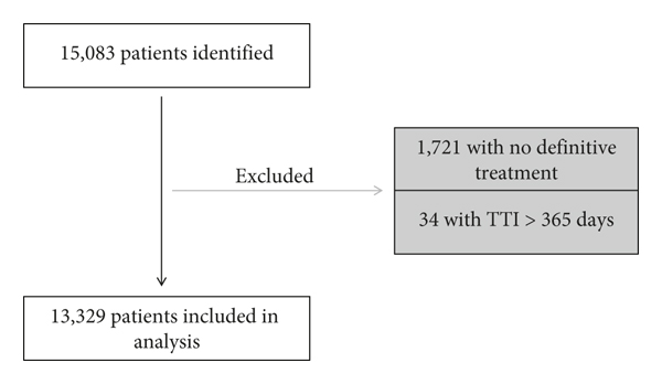Adult patients (≥18 years old) with PBS diagnosed between 2004 and 2013 were identified using topographical codes (C40.0-C40.3, C40.8-C41.4, C41.8, C41.9) designated by International Classification of Disease for Oncology, Third Edition (ICD-O-3). To be included, a patient also required an ICD-O-3 histology code consistent with a PBS. These codes identified a total of 15,083 patients with a PBS. Patients were excluded if they did not receive definitive treatment in the form of surgery, radiotherapy, systemic therapy, or other forms of treatment (). Additional patients were excluded if TTI was >365 days () due to potential recording error or patient decision to voluntarily delay treatment.