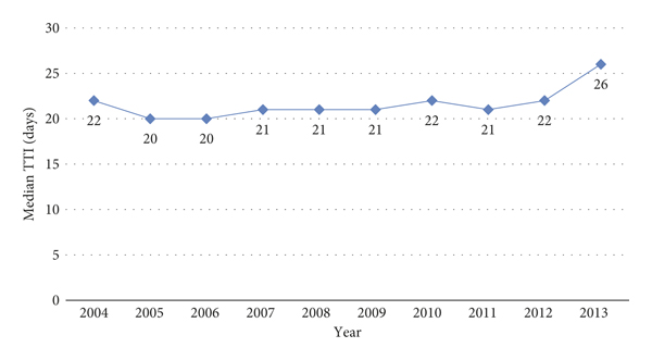 In order to determine significant variances in TTI within a variable, the Kruskal–Wallis test was used for nonparametric univariate analysis. Multivariate analysis was performed using negative binomial regression models, containing all covariates to control for confounders. values were considered significant if . Incidence rate ratio (IRR) is defined in the following manner—for every 1-point increase in the independent variable, while holding all other variables in the model constant, the TTI rate (in days) would increase by a factor of that value. Statistical tests were conducted using Stata Version 14 (College Station, TX).