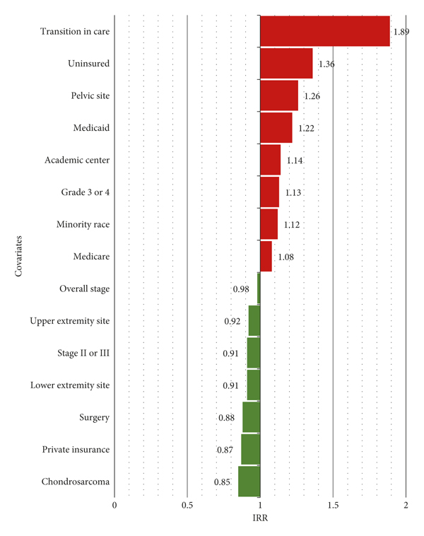 Pelvic tumor location (IRR = 1.26; 95% CI, 1.19–1.35; ) was associated with increased TTI compared to all other anatomical sites. Intermediate grade tumors (grade 2 (IRR = 1.24; 95% CI, 1.12–1.38; )) and higher grade tumors (grade 3/4 (IRR = 1.13; 95% CI, 1.03–1.23; )) correlated with increased TTI compared to grade 1 tumors. Patients with chondrosarcoma had significantly decreased TTI compared to all other diagnoses (IRR = 0.85; 95% CI, 0.79–0.92; ). Other tumor factors that significantly decreased TTI include upper extremity tumors (IRR = 0.92; 95% CI, 0.85–0.99; ) and lower extremity tumors (IRR = 0.91; 95% CI, 0.86–0.96; ) compared to all other primary tumor sites, and stage II/III (IRR = 0.91; 95% CI, 0.85–0.98; ) compared to all other stages. Larger tumor size (IRR = 1.00; 95% CI, 0.95–1.05; ), and an osteosarcoma diagnosis (IRR = 1.03; 95% CI, 0.97–1.09; ) did not significantly influence TTI.