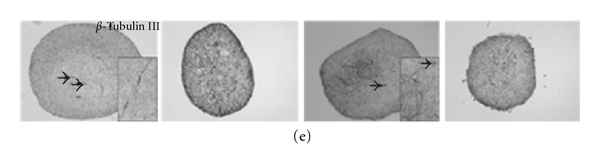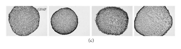 β Tubulin type III and TH were used as markers for immature neurons and dopaminergic neurons, respectively. None of the protocols did stimulate dopaminergic differentiation of the VM NTS, as indicated by the absence of TH-positive cells. Instead intense β Tubulin type III immunoreactivity was observed in the central cell mass of the plated NTS (Figure 6(a)). Most of the cells in the differentiated VM NTS, however, expressed the astroglial marker GFAP and exhibited characteristic astroglial morphology (Figure 6(a)).