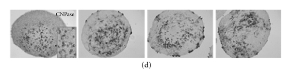 CNPase-positive cells were identified in clusters in the core of the NTS (Figure 5(d)). The highest density of CNPase-positive cells was observed in the oldest cultures (Figure 5(d); 237 DIV), but the distribution and number of CNPase-positive cells did vary considerably between the individual NTS.