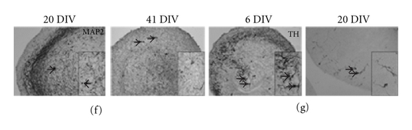 No NeuN-positive, MAP2ab-positive, or TH-positive cells were observed in the long-term propagated NTS at 63–237 DIV. In contrast to this, both MAP2ab-positive (Figure 5(f)) and TH-positive (Figure 5(g)) cells were present in the newly established NTS (6–41 DIV), while NeuN-positive cells were not identified in newly established NTS either. The data suggest that the fully differentiated neuronal cells in the NTS were eliminated in the NTS with increased propagation time. It could be suspected that this was caused by the use of HNSC-proliferation medium, which “favours” undifferentiated cells, and the passaging technique, which may disrupt the neuronal cell processes and connections.